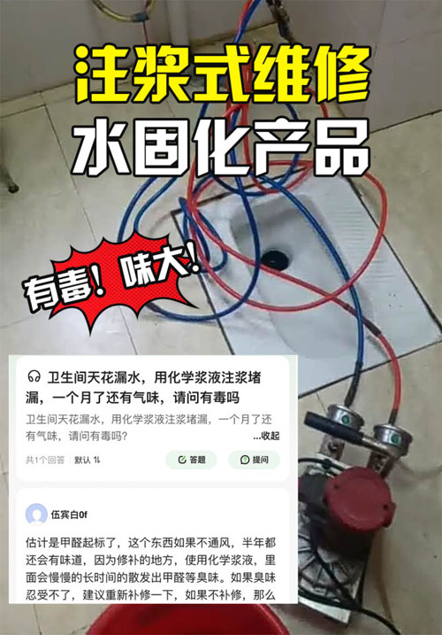 1、注浆液大多数为“水固化”该产品遇水溶胀,失水就收缩,原本堵上的地方过了不久后就会收缩脱落,不仅问题没解决,瓷砖上还多了两个难看的孔洞;